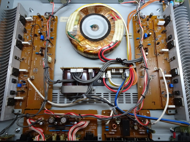 センターSP高域用のSONY SRP-P2070をメンテした。この機種は50W+50W パラレルプッシュプル機である。バランス入力、ブリッジ接続、入力ボリュームもついており使い勝手が良い。音も素直で鮮度が良い。とこの時点では、思っていた。メンテ内容は電源部の電解Cの頭が膨らみ気味だったので、交換。その他の電解CはVISHAYとニチコン オーディオグレードに交換。560Ω抵抗をVISHAYに交換。SP保護リレーをオムロン製に交換などなど。ちなみに勘違いして散財したが、SRP-P50とは保護回路の設計が違っていて、使っているリレーも違います。SRP-P50用だと大きくて取り付きません。入力ボリュームのツマミの形状が違うだけで中身は同じだろうと勝手に勘違いしたのが失敗でした。以下がメンテ後。良くみるとパーツが変わっているのが、わかるでしょう。ダイオードもショットーキーに替え、電流容量も上げ、さらにファインメットビーズを4つ追加しました。この機種は基板同士がコネクタ接続なので、メンテはやりやすいです。ただし薄型なので筐体の剛性はないです。自分は足をTAOC TITE26Rにしました。もともとラックマウント設計なので、足は付いてません。底板は完全にフラットです。
