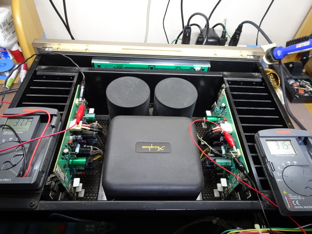 これで左右のアンプの差は、ほとんど無くなった。ブリッジ接続の場合、アンプが直列接続になるので、極力同じ特性のほうが良い結果が得られる。これでバイアスも31.7mVと31.5mVにきっちり調整したので、本来の性能を発揮してくれるだろう。基板上のコンデンサに膨らみは無かったので、このまま使うことにする。